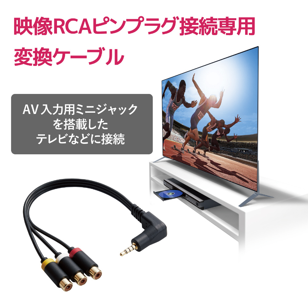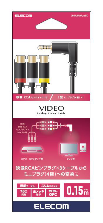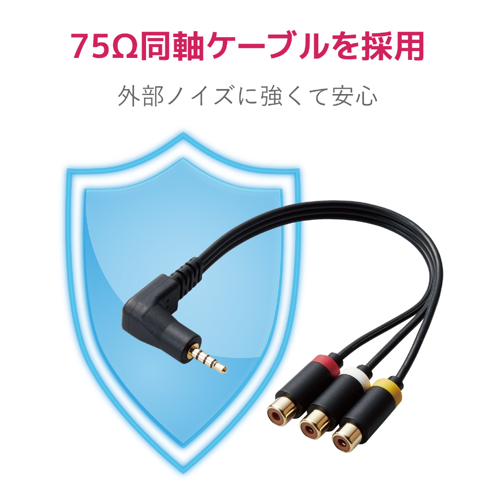 映像RCAピンプラグ×3ケーブルからミニプラグ(4極)への変換に最適。 ビデオ/DVDデッキ等に接続されているお手持ちの映像RCAピンプラグ×3ケーブルに接続することで、AV入力用ミニジャック(4極)を搭載したテレビ等に接続して映像と音声を出力できるアナログビデオ変換ケーブル。