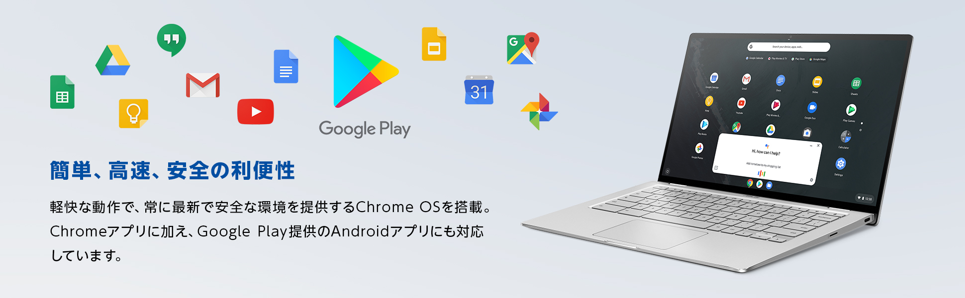 軽快な動作で、常に最新で安全な環境を提供するChrome OSを搭載。Chromeアプリに加え、Google Play提供のAndroidアプリにも対応しています。