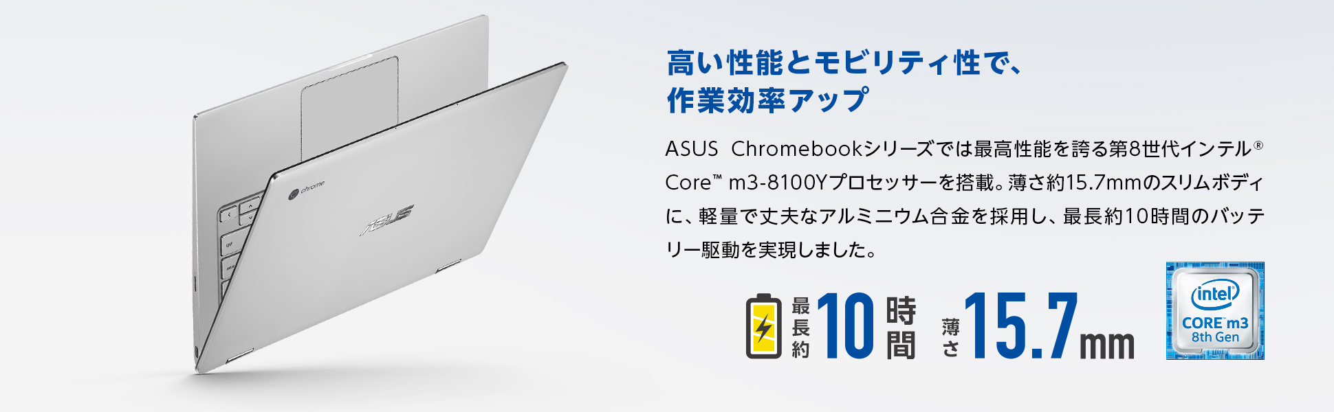 高い性能を誇る第8世代インテル Core m3 - 8100Yプロセッサー、4GBメモリを搭載。薄さ約15.7mmのスリムボディには、軽量で丈夫なアルミニウム合金を採用し、最長約10 時間のバッテリー駆動を実現しました。