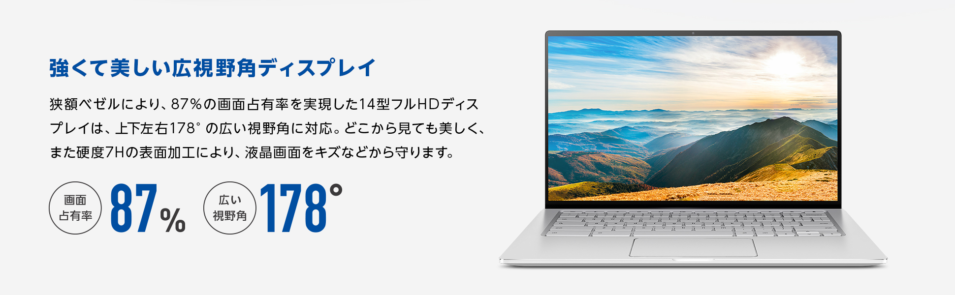狭額ベゼルにより、87%の画面占有率を実現した14型フルH Dディスプレイは、上下左右178°の広い視野角に対応。どこから見ても美しく、また硬度7Hの表面加工により、液晶画面をキズなどから守ります。