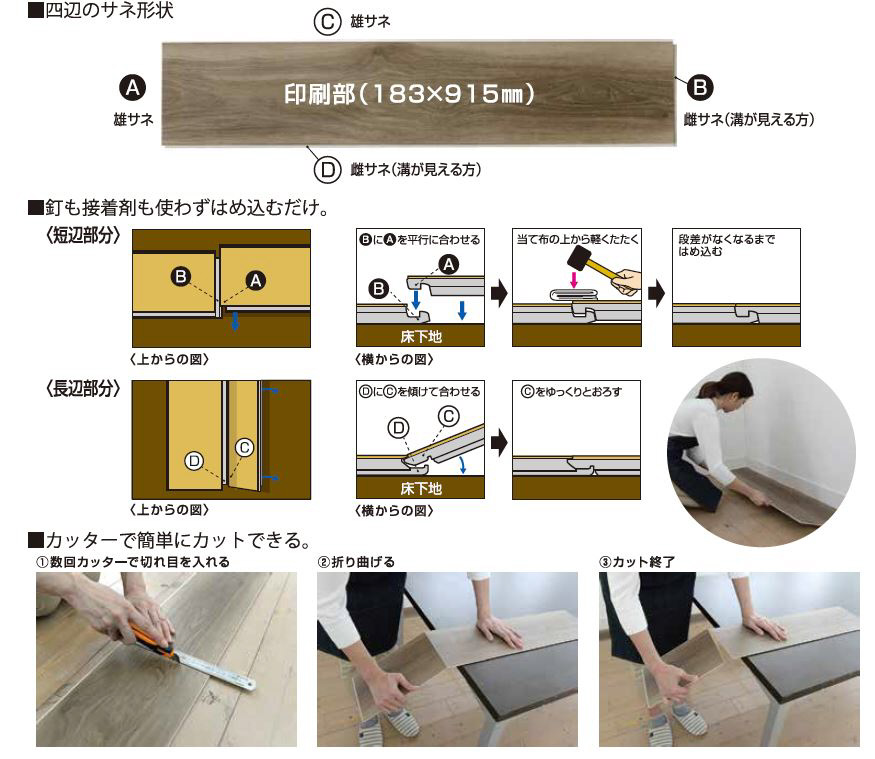 釘や接着剤を使わず、カチッ!とはめ込むだけでフローリングの仕上がりになります。