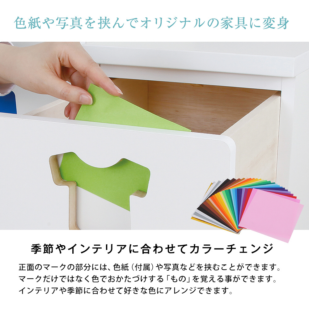 正面のマークの部分には、色紙(付属)や写真などを挟むことができます。マークだけではなく色でおかたづけする「もの」を覚える事ができます。インテリアや季節に合わせて好きな色にアレンジできます。