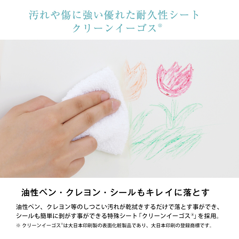 油性ペン、クレヨン等のしつこい汚れが乾拭きするだけで落とす事ができ、シールも簡単に剥がす事ができる特殊シート「クリーンイーゴス」を採用。