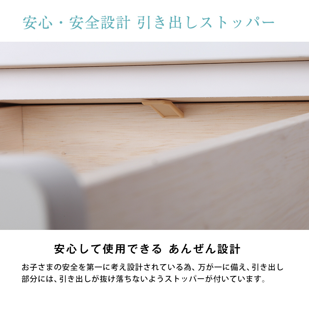 お子さまの安全を第一に考え設計されている為、万が一に備え、引き出し部分には、引き出しが抜け落ちないようストッパーが付いています。