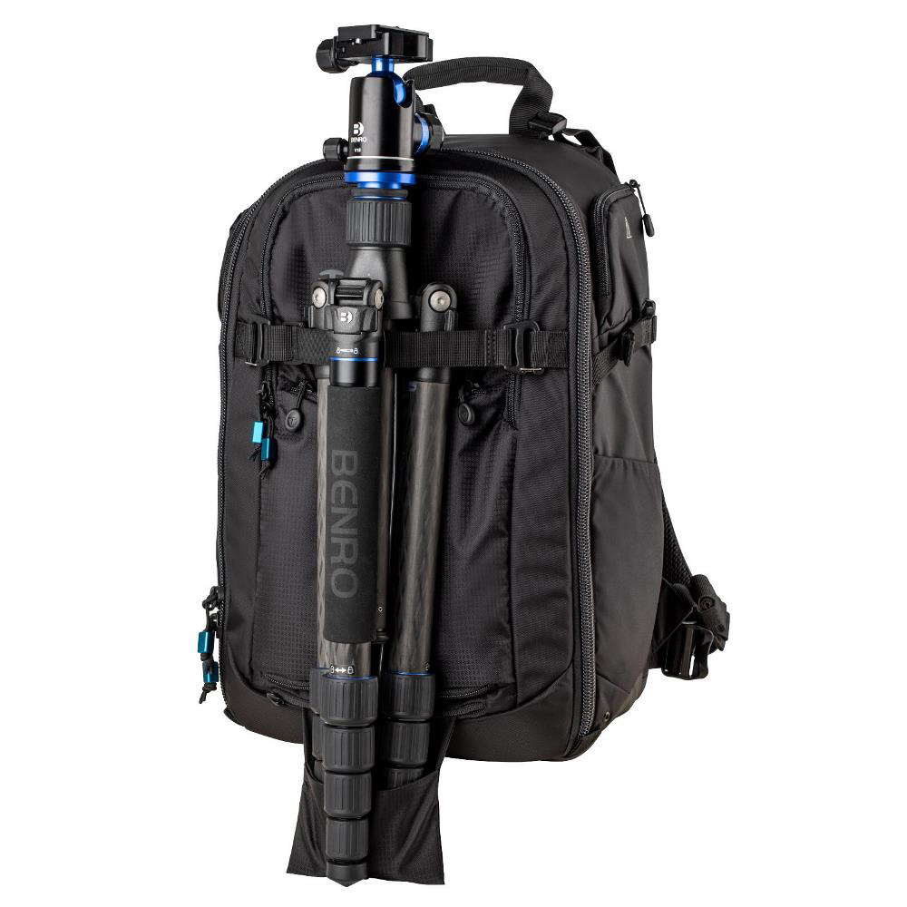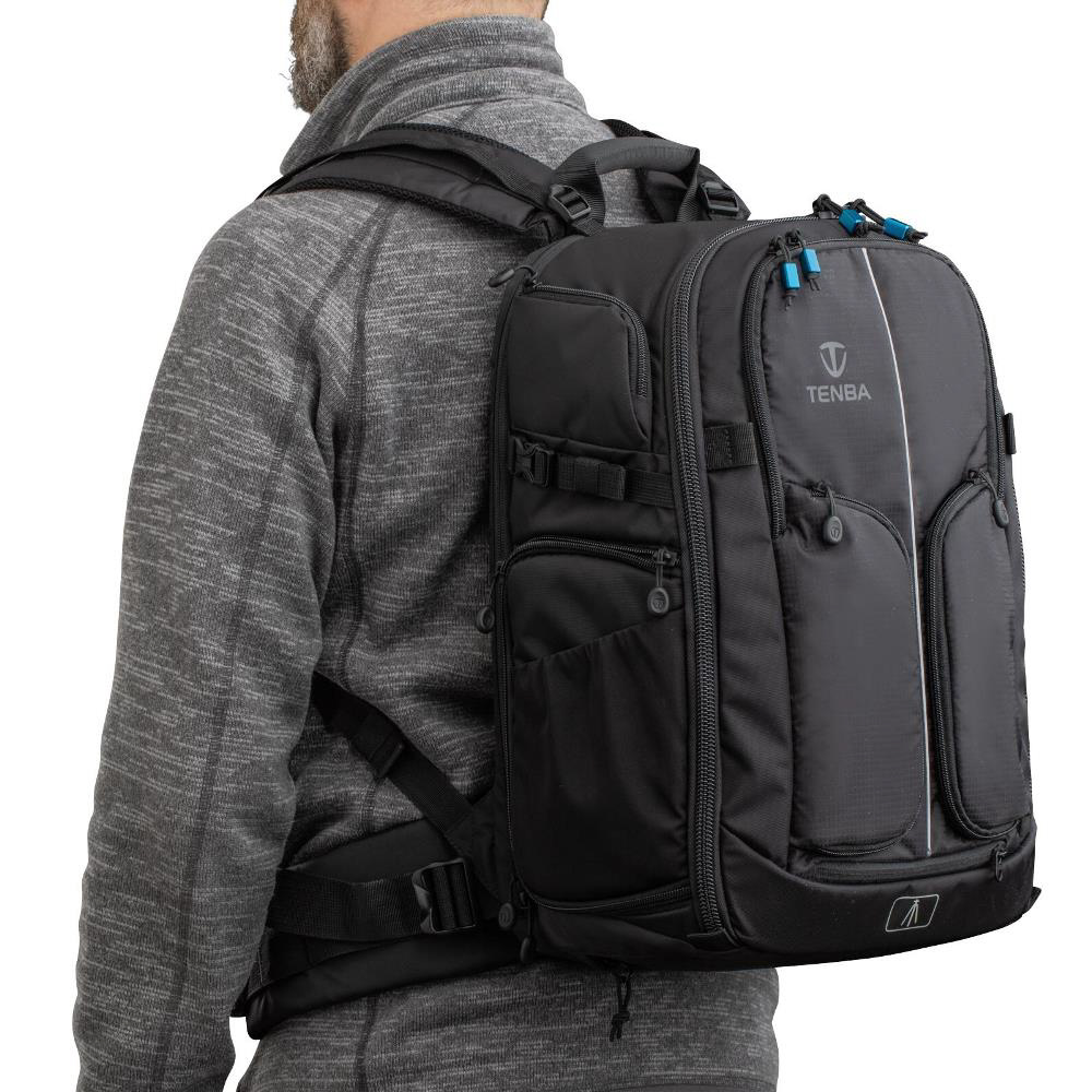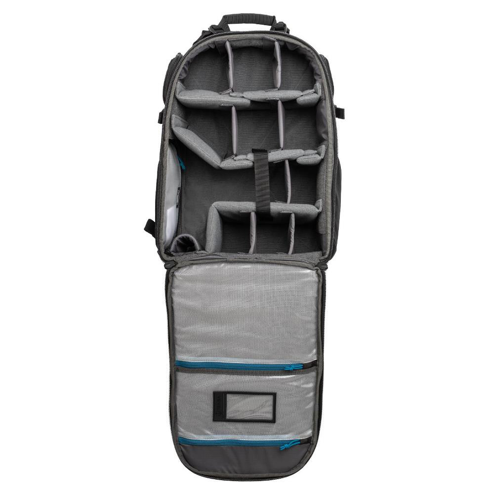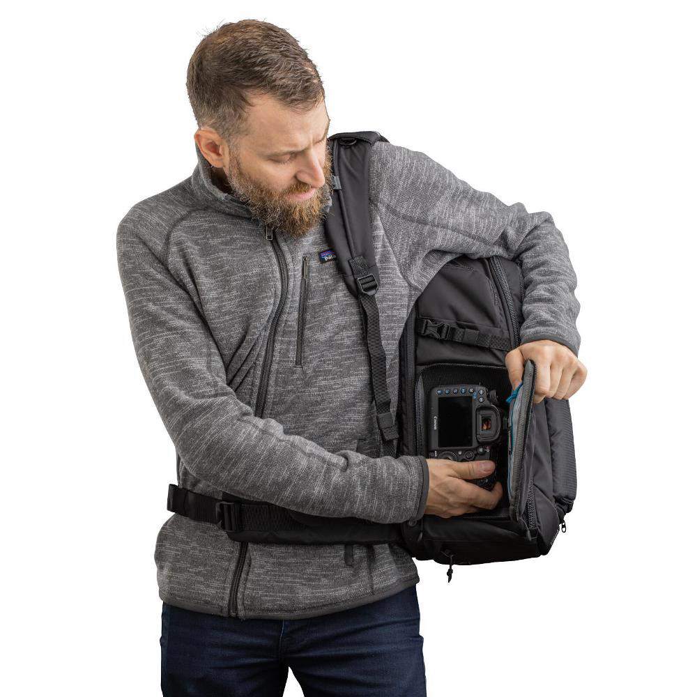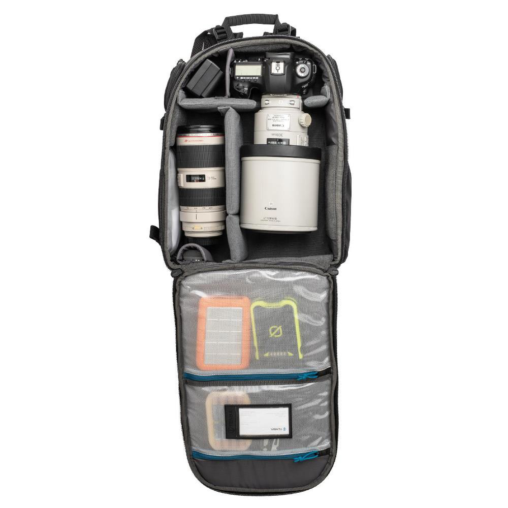 プロ向けのカメラシステム一式と15インチのラップトップPCが収まるフロントアクセスタイプ大型バックパック