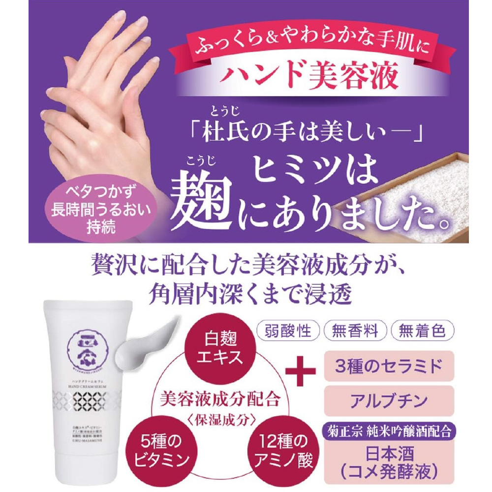 日本酒の主要原料である“麹”。酒蔵の杜氏の手がキレイなのは、この“麹”に触れているからだといわれています。米からできる“麹”には、ビタミンやアミノ酸・セラミドといった肌にうれしい成分が満載なのです。白麹エキスで杜氏の手のようなやわらかで美しい手肌を実現します。
