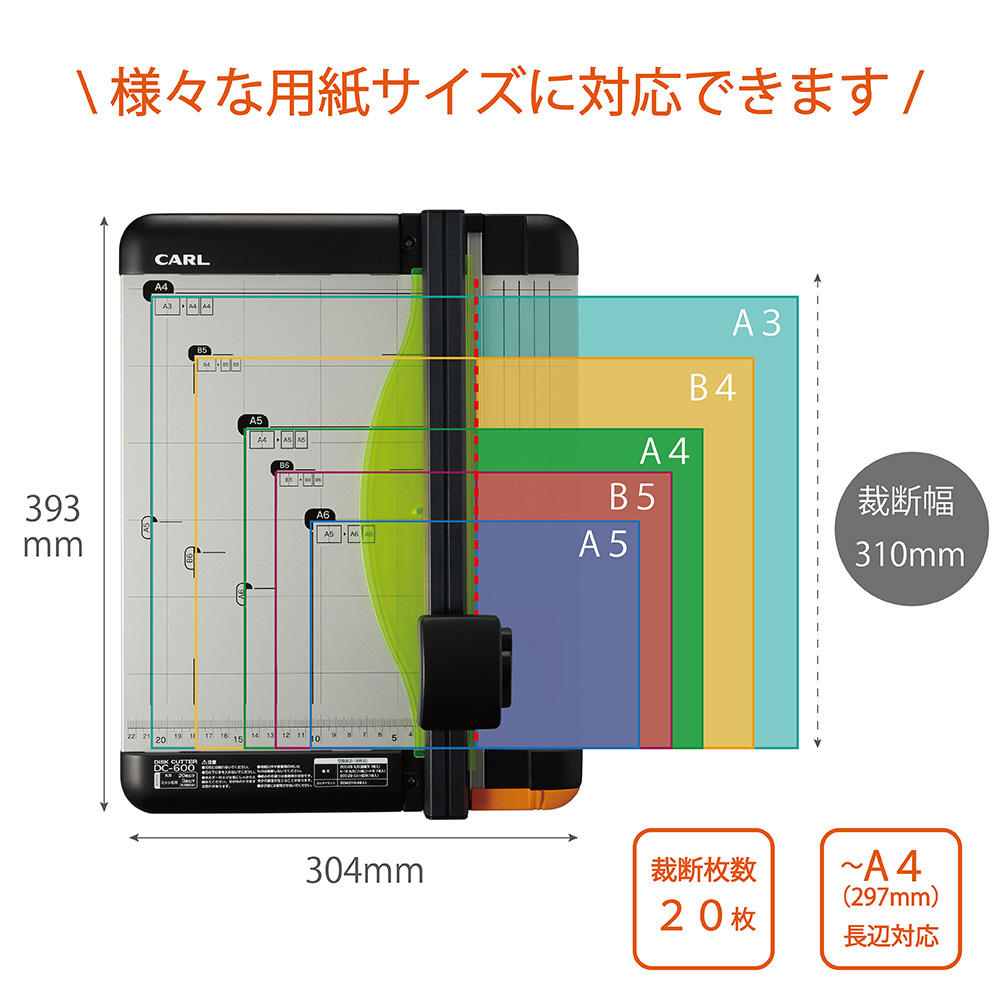 | 仕様1 | ■本体サイズ:W304×L393×H79mm■本体重量:1.7kg■パッケージサイズ:W410×L310×H85mm■パッケージ重量:2kg■対応サイズ:A4■裁断枚数(丸刃):20枚(約1.8mm厚 1往復で20枚裁断)■裁断枚数(ミシン目刃):3枚(約0.27mm厚)■裁断幅:310mm 注:裁断枚数は、コピー用紙(約0.09mm厚)使用時での枚数です。 |