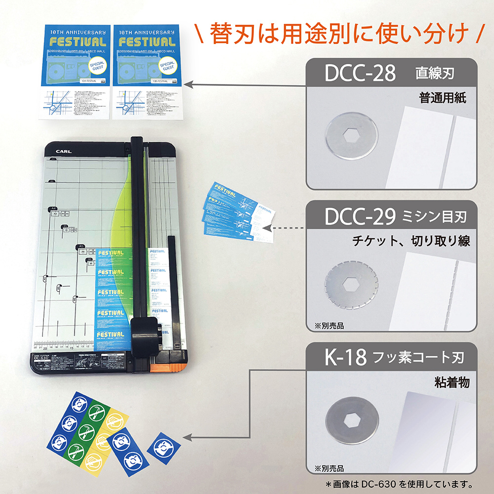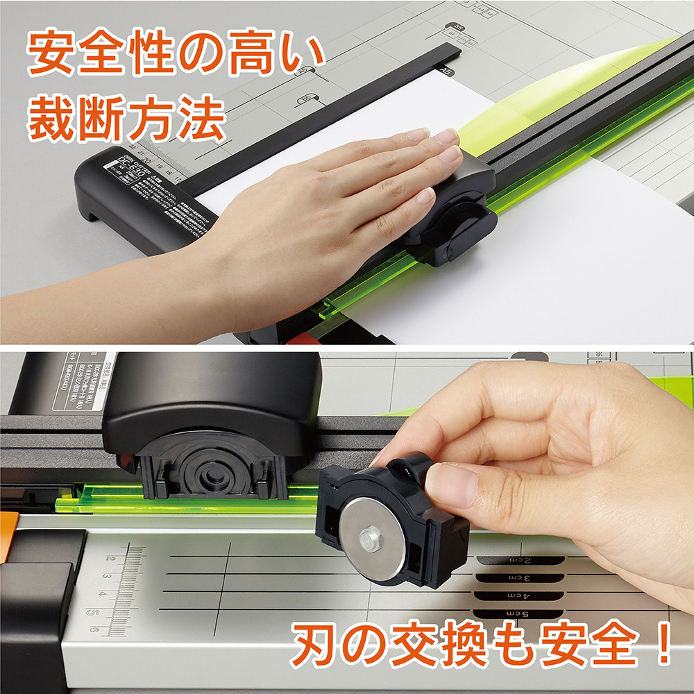 盛りが盤面の左側/右側の両方に付いているから、裁断用途に合わせて使い分けができます。視覚的にわかりやすいイラストで表現された目盛りによって、規格サイズの用紙を半分に切ることも、短冊やカードなどの小さなものを切ることも、どちらの作業にも対応しています。※購入時は丸刃とカッターマットが本体に装着済みです。