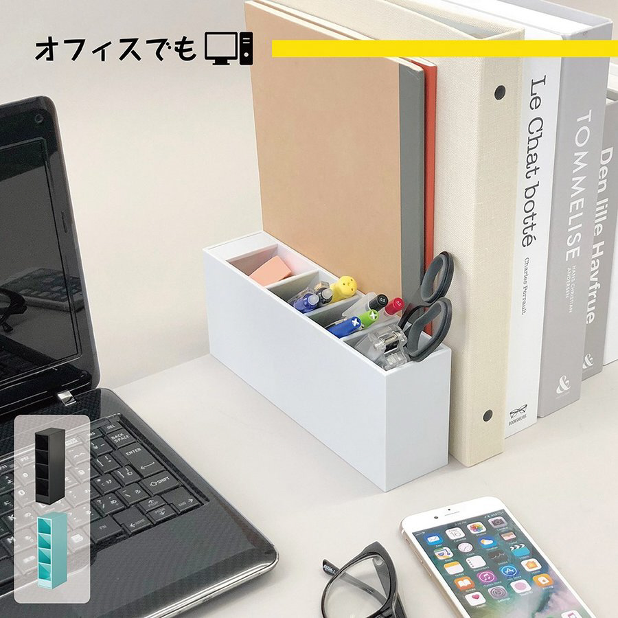 縦にも横にも置けるので、デスクの空いているスペースに合わせて置くことができます。縦置き時は仕切りに40度傾斜角度がついているから、筆記具を出し入れしやすい構造になっています。収納幅の違いで2サイズの展開。