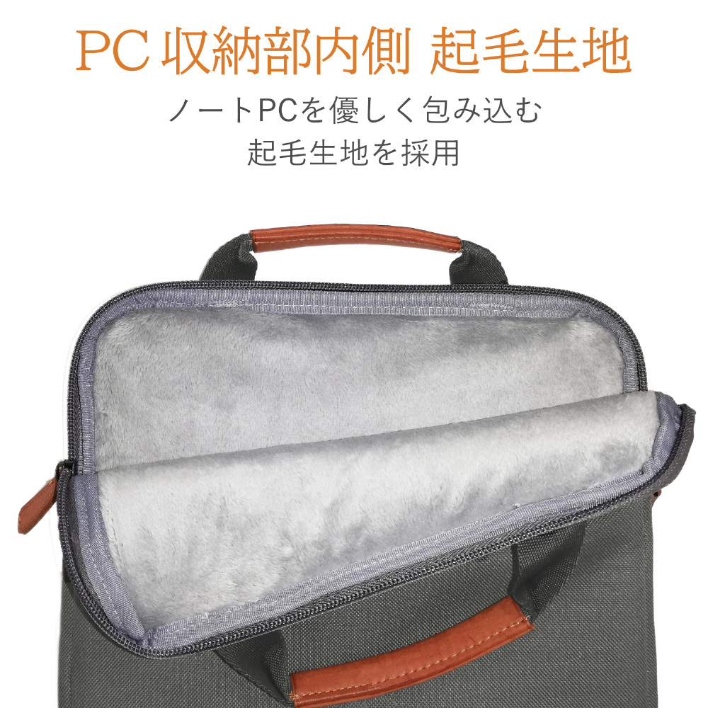 PC収納部内側には、出し入れ時にパソコン本体を傷つけにくい起毛素材を採用しています。