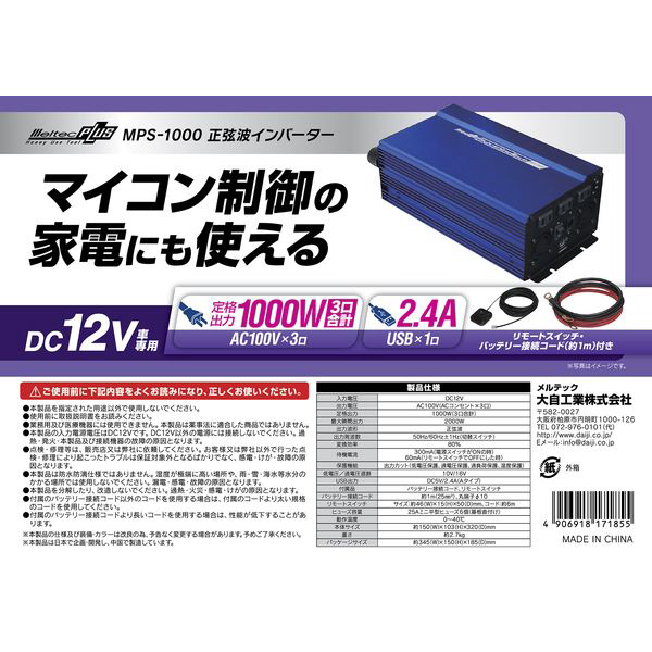 | 商品名 | MPS-1000 大容量正弦波インバーター 定格出力1000W |