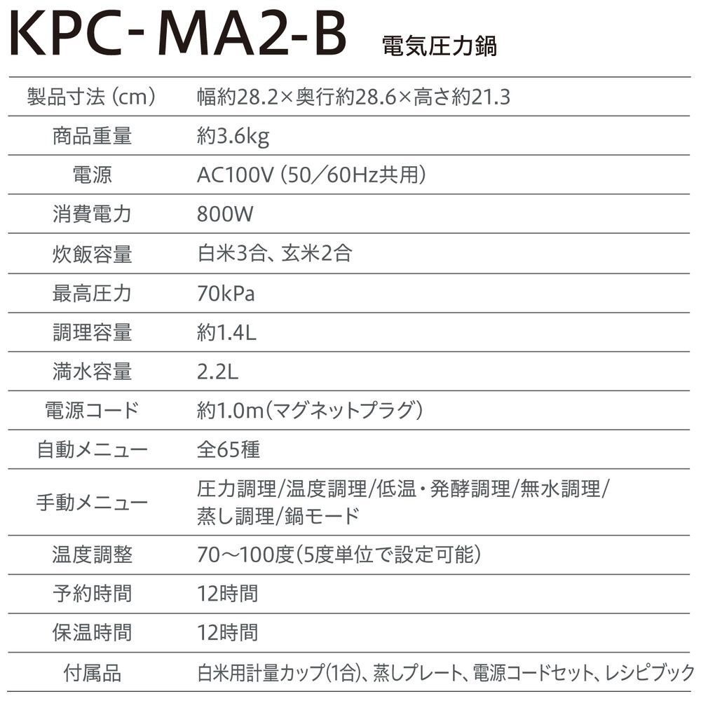 | 商品名 | 電気圧力鍋 2.2L KPC-MA2-B 【864】 |