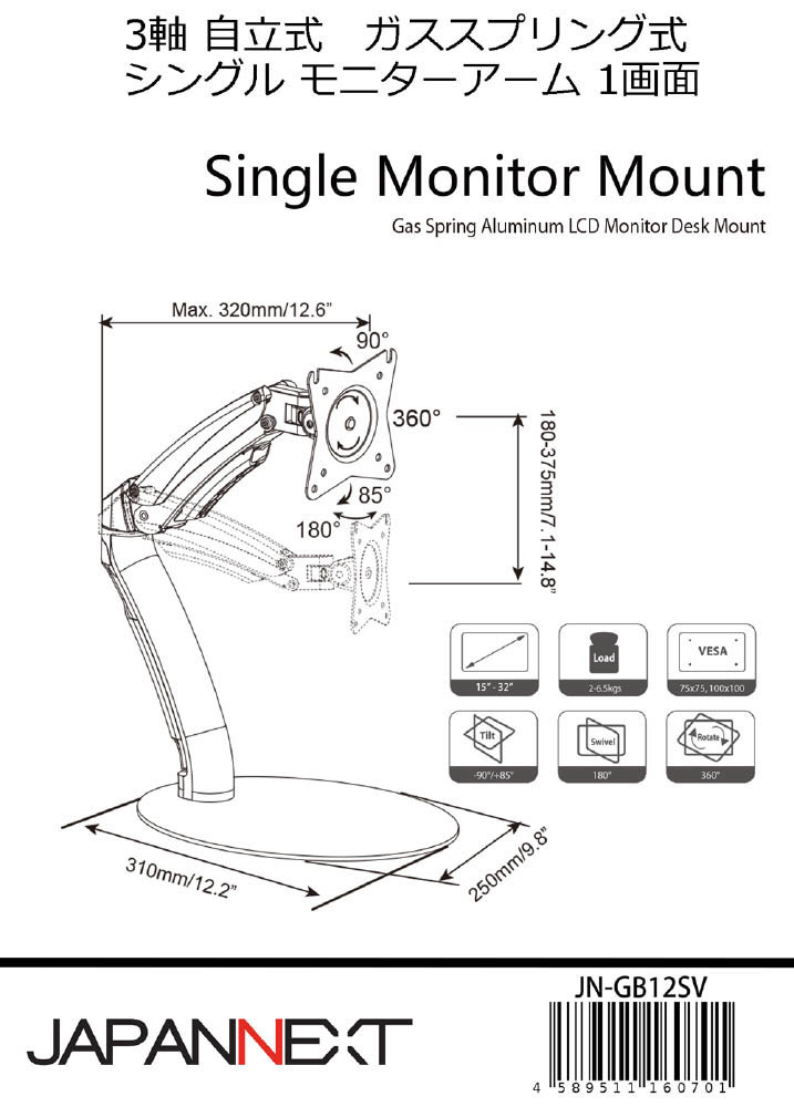 JN-GB12SV 液晶ディスプレイアーム [15-32インチ対応/モニターアームガス式/3軸]
