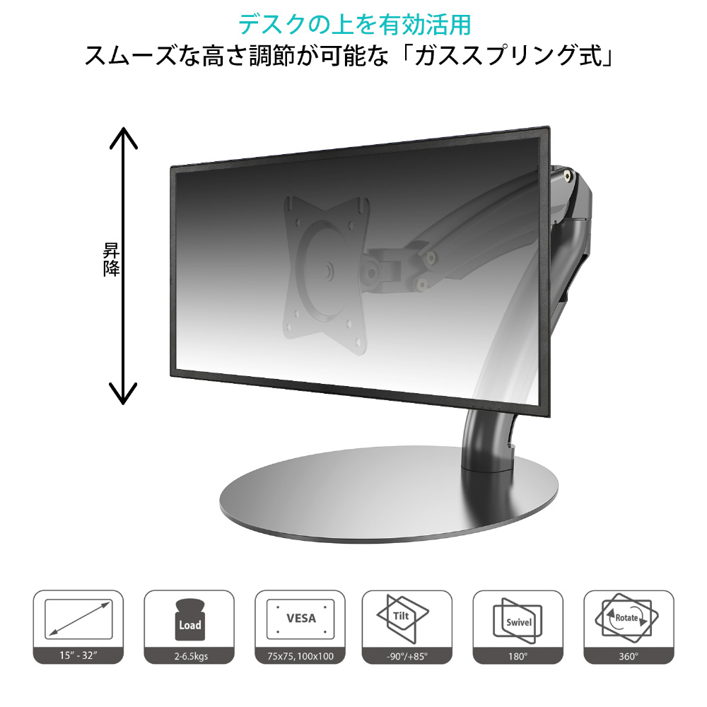 液晶ディスプレイ・モニターアーム 3軸 自立式 ガス式 多関節 チルト、スイーベル、回転機能 15-32インチ対応 VESA規格対応(75x75mm、100x100mm)