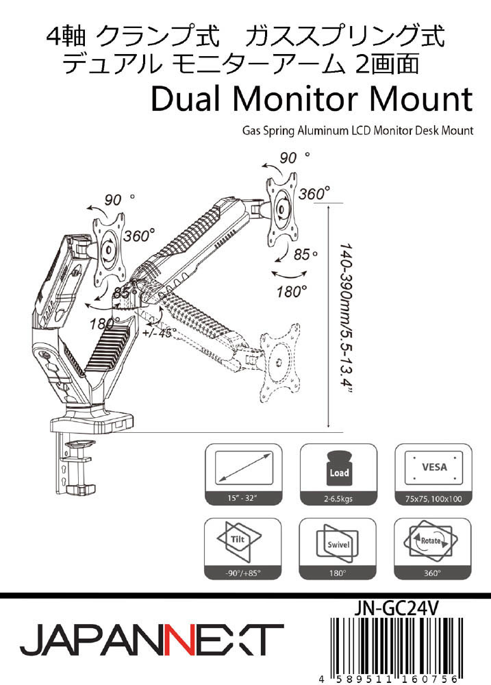 JN-GC24V デュアルモニターアームガス式液晶ディスプレイアーム クランプ対応 15-32インチ対応 耐荷重2-6.5kg 2画面 4軸 垂直 水平 多関節
