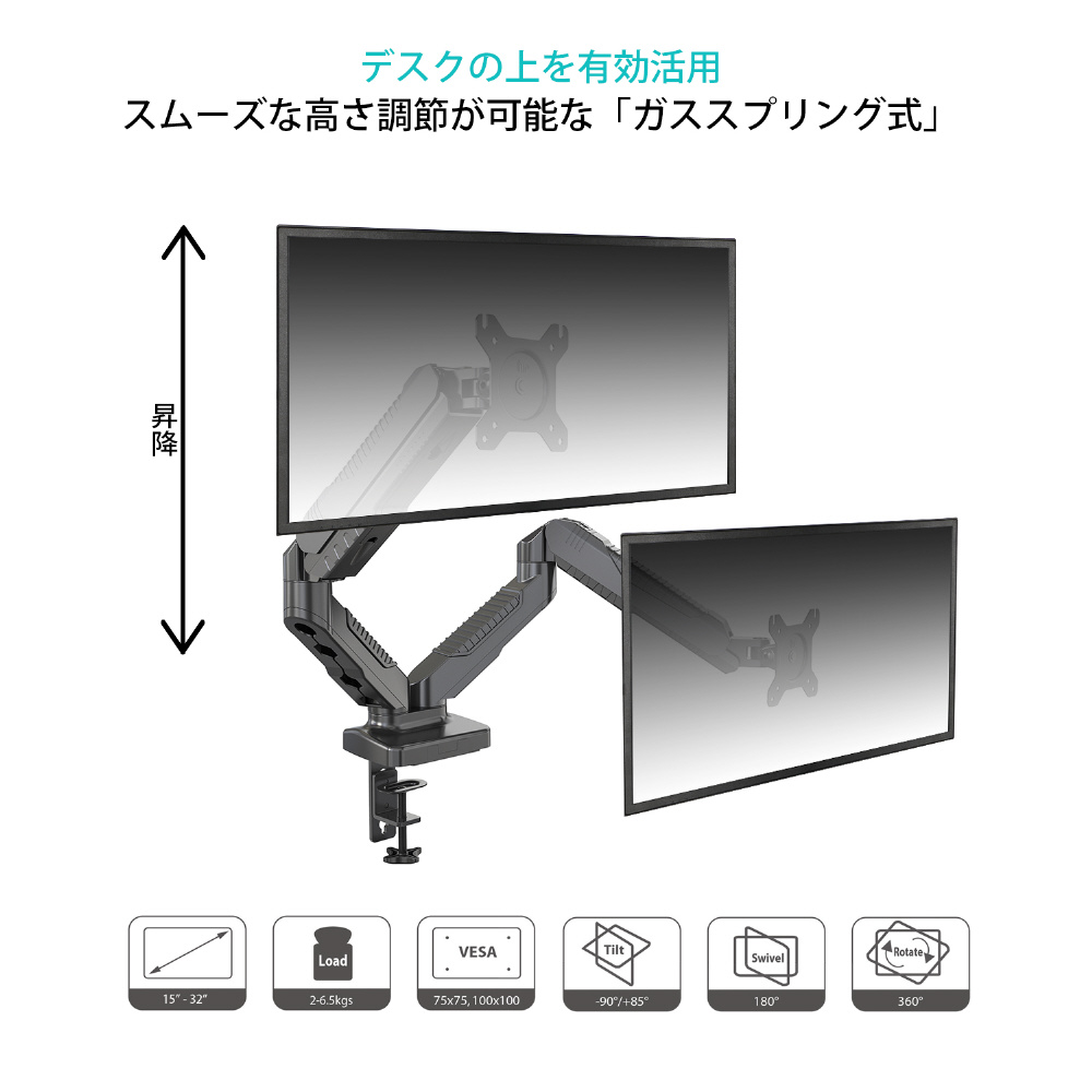 デュアルモニターアーム ガス式 液晶ディスプレイアーム クランプ式 15-32インチ対応 耐荷重2-6.5kg 2画面 4軸 垂直、水平、回転機能 多関節 VESA規格対応(75x75mm、100x100mm)