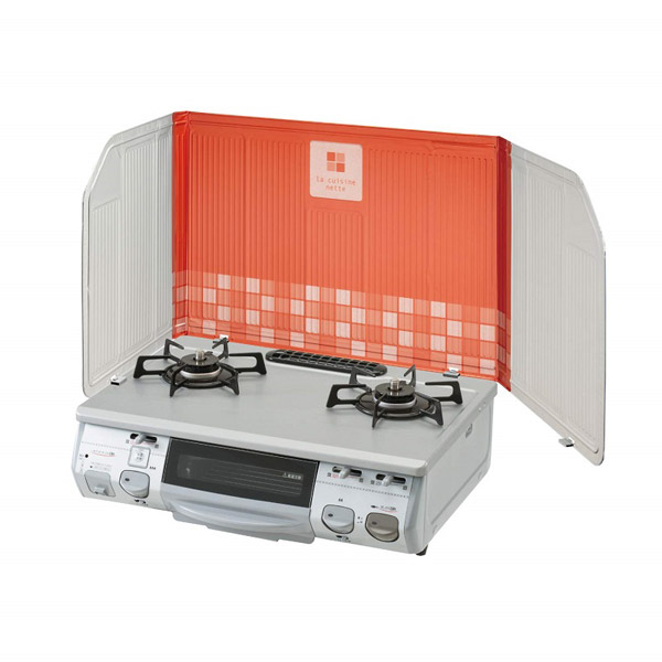 両サイドをしっかりカバーオレンジ色のオシャレなコンロ周り油汚れ防止パネルキッチンを明るくオシャレに着飾ります。