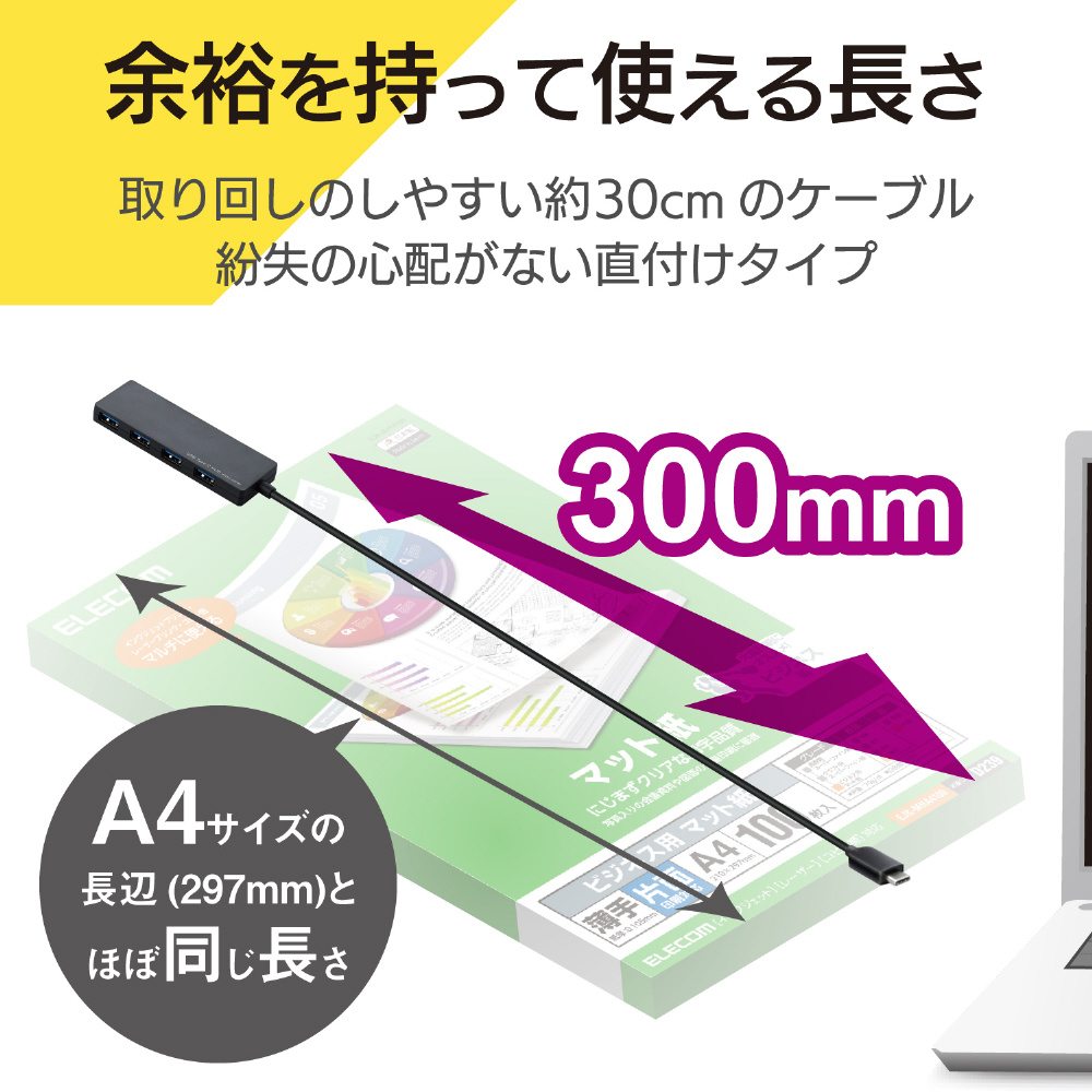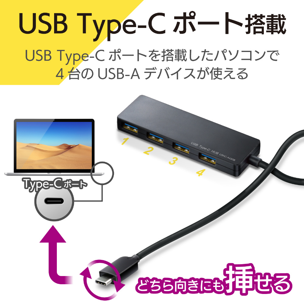 | 商品名 | U3HC-A430BXBK Type-C/Aメス4ポート/バスパワー/30cmケーブル/ブラック 【864】 |