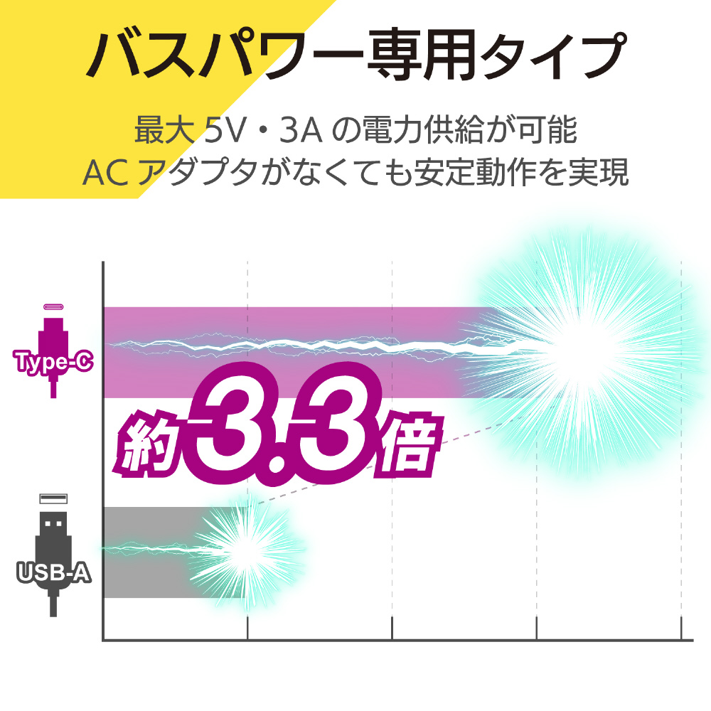 ●最大5V3Aの電力供給が可能で、ACアダプタがなくても接続機器の安定動作を実現します。