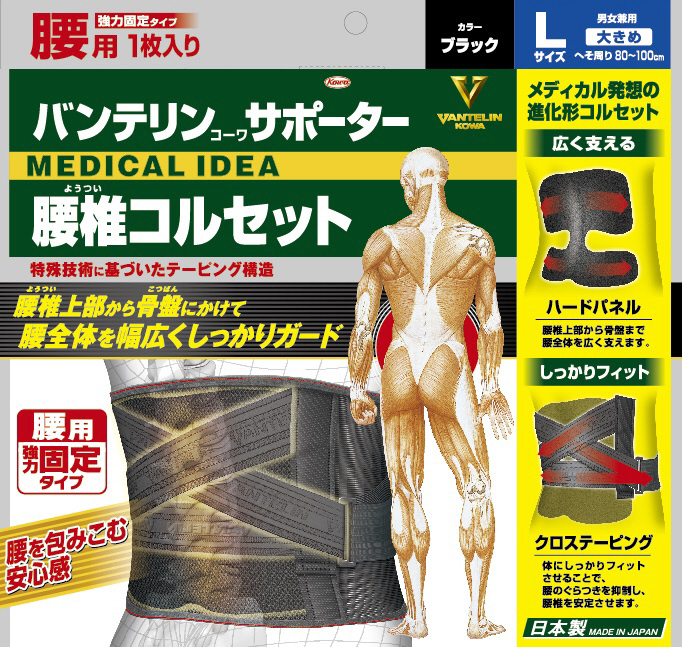 メディカル発想の進化型コルセット!広く支えるハードパネルとしっかりフィットさせるクロステーピング構造で腰を支えます。