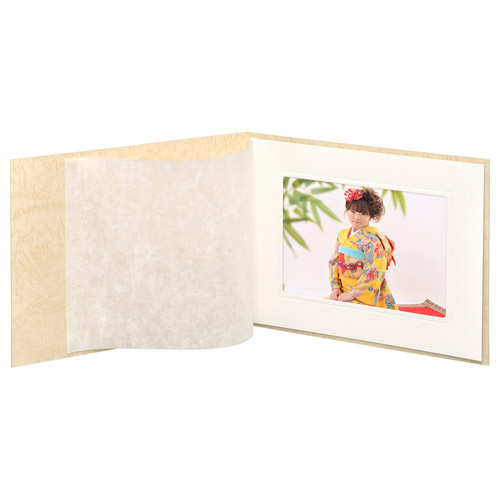 中額の中抜きの外周に施した空押しのライン装飾が写真を引き立たせます。中に綴じられた和紙が、写真をやさしく保護するとともに高級感を演出します。