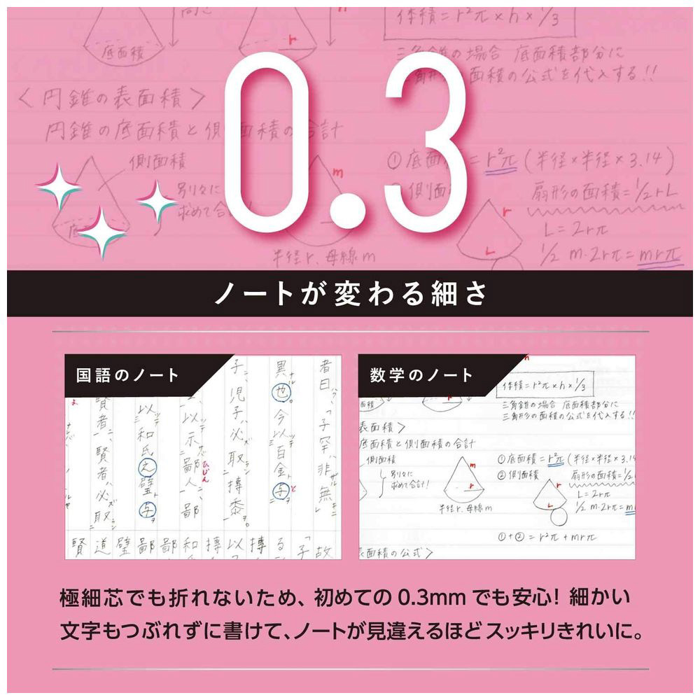 芯が減るのに合わせて先端パイプがスライドするオレンズシステムを搭載。芯を出さないで書くから不思議なほど芯が折れないシャープペンシルです。超極細芯0.2と極細芯0.3の2タイプ。