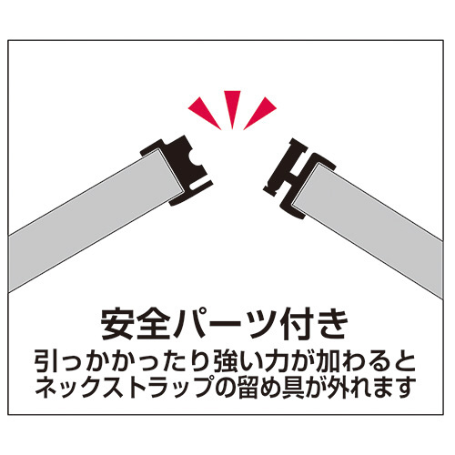 引っかかったり強い力が加わると、ネックストラップの留め具が外れる安全パーツ付き。