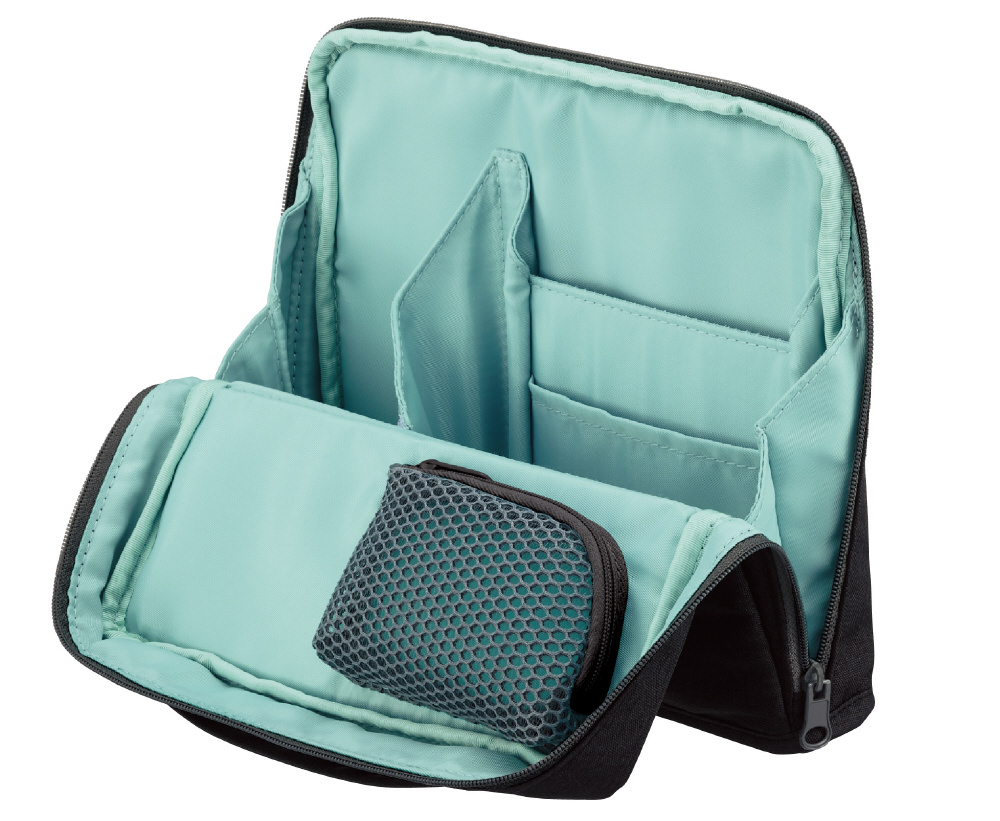●サイドに固定ベルトを留めると自立します。スタンド式で開口部が前方に広がり、中身が見やすく取り出しやすい。