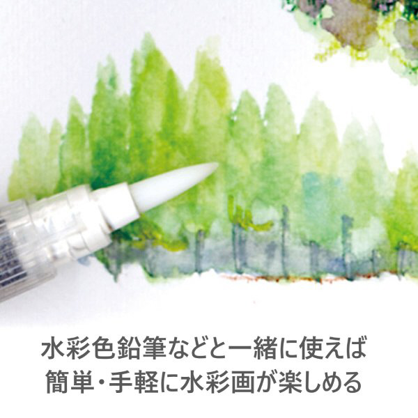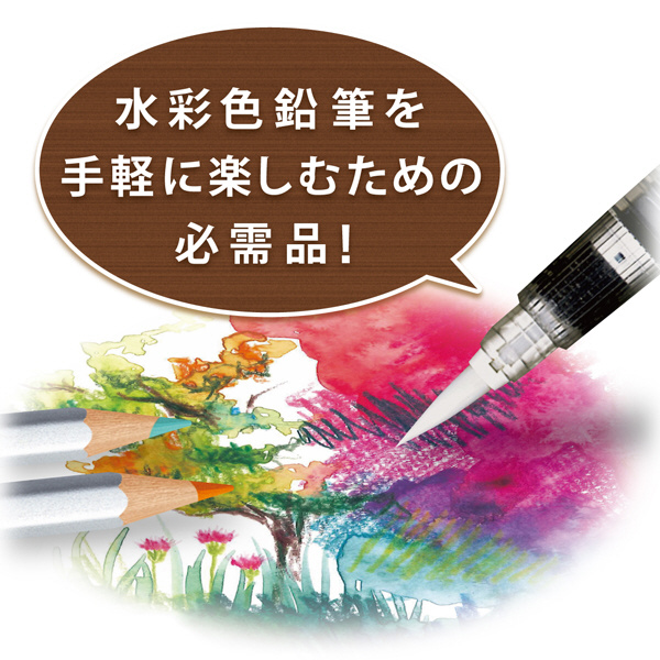 カラト アクェレル、エルゴソフトなどの水彩色鉛筆とあわせて使えば水彩画タッチの描画・ぼかし・混色などの表現ができます。水を入れた後、軸部分を押すと筆先がぬれ、いつでも気軽に水彩表現が楽しめる大変便利な筆です。