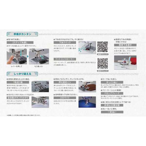 ・下糸を引き出さなくてもすぐ縫える「下糸クイック」や、面倒な下糸の準備も手軽にできる「簡単下糸巻き」で、準備がカンタンです。