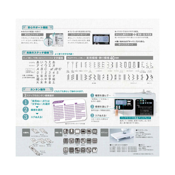 | 仕様2 | ■模様選択: 40種類 (直線ぬい[左基線・中基線]、3重ぬい、伸縮ぬい、ジグザグ、3点ジグザグ、たち目かがり3種類、まつりぬい2種類、アップリケ、ファゴティング、ボタン穴かがり3種類、かんどめ、キルト用手ぬい風直線、キルト用アップリケ2種類、飾り模様13種類、クロスステッチ5種類、飾りサテン2種類) |
