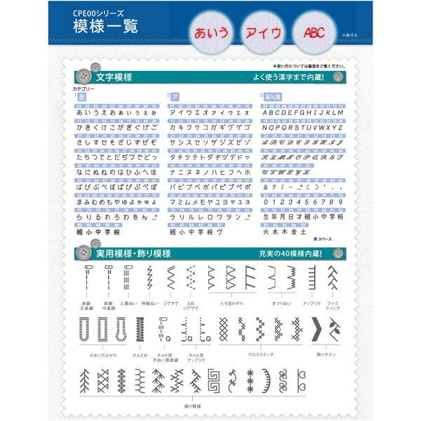 ・刺しゅう機なしで手軽に名前などを入れられる文字模様は、よく使う文字をしっかり内蔵。