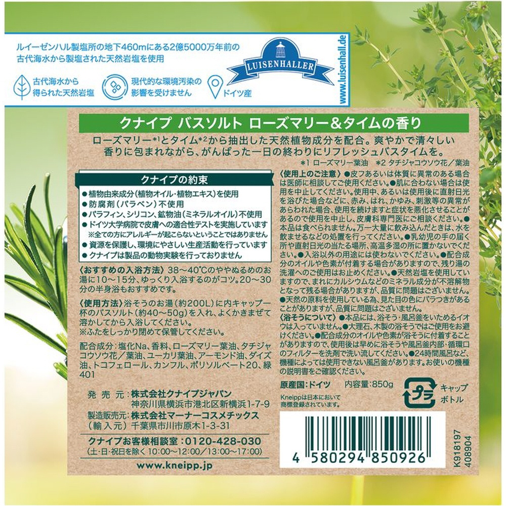 | 成分 | 塩化Na、香料、ローズマリー葉油、タチジャコウソウ花/葉油、ユーカリ葉油、アーモンド油、ダイズ油、トコフェロール、カンフル、ポリソルベート20、緑401 |