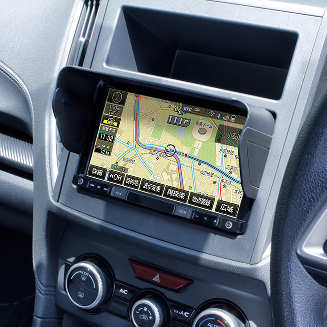 使いたいときにナビゲーションと車両パネルの隙間にさっと固定でき、夜間等の必要ないときは取り外しできる。
