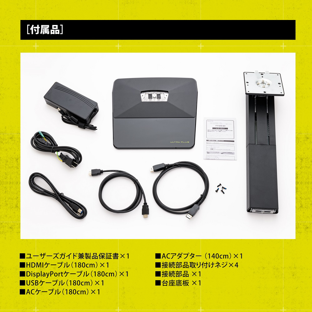 ■付属品:ユーザーズガイド兼製品保証書×1、HDMIケーブル(180cm)×1、DisplayPortケーブル(180cm)×1、USBケーブル(180cm)×1、ACケーブル (180cm)×1、ACアダプター (140cm)×1、接続部品取り付けネジ×4、接続部品×1、台座底板×1