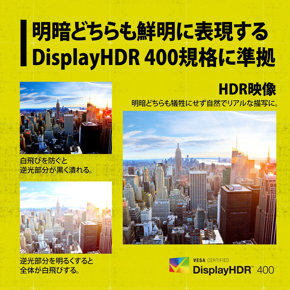 | 仕様3 | ブルーライト削減機能:対応 フリッカー削減機能:対応 FreeSync 2 HDR:対応 VESA DisplayHDR 400:対応 |