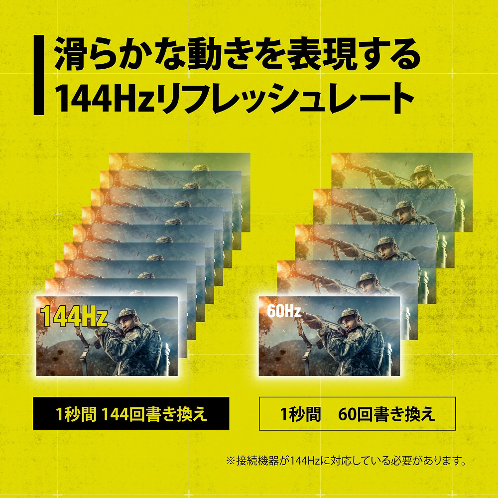 また、滑らかな動きを表現する144Hzリフレッシュレートに対応し、今まで描画しきれなかったフレームも描画され、より滑らかに画面を表示します。
