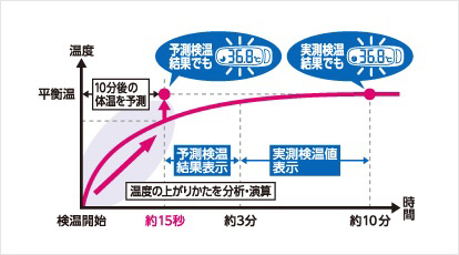 検温を開始してからの体温の変化を、当社独自の分析・演算技術で高速演算処理し、約15秒で約10分後の体温を予測します。