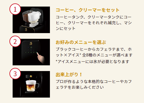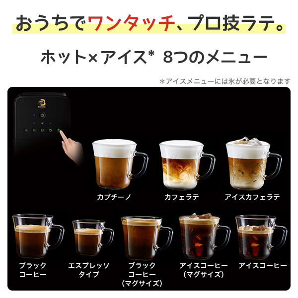 コーヒータンクとブライトタンクの2種類のタンクを搭載し、8つの本格メニューを指先ひとつで作ることができ、