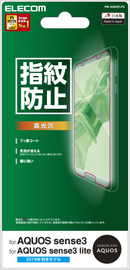 AQUOS sense3、AQUOS sense3 liteの液晶画面をキズや汚れから守る、指紋防止タイプの高光沢フィルムです。