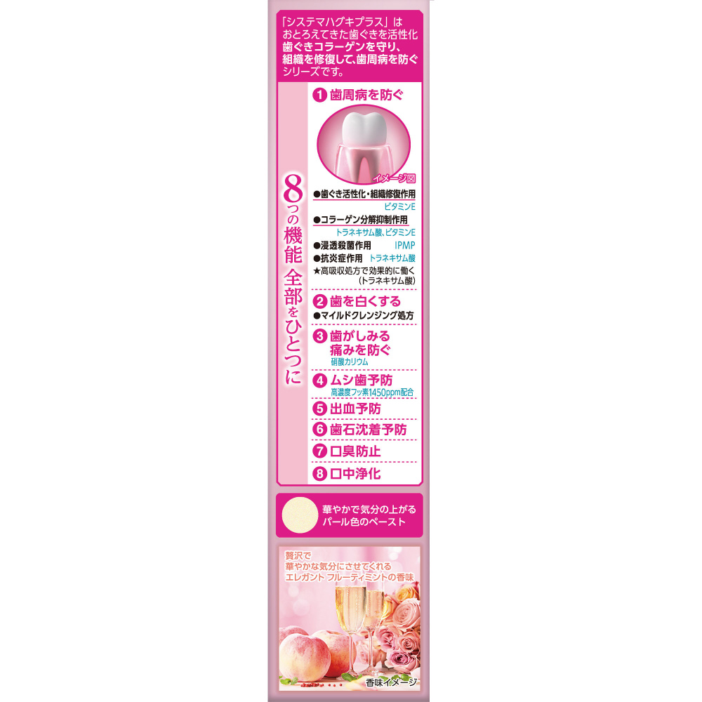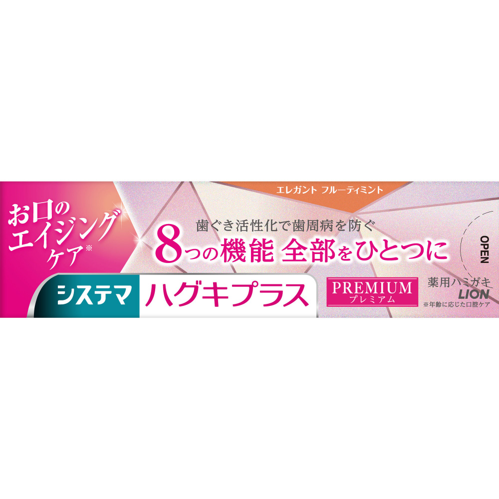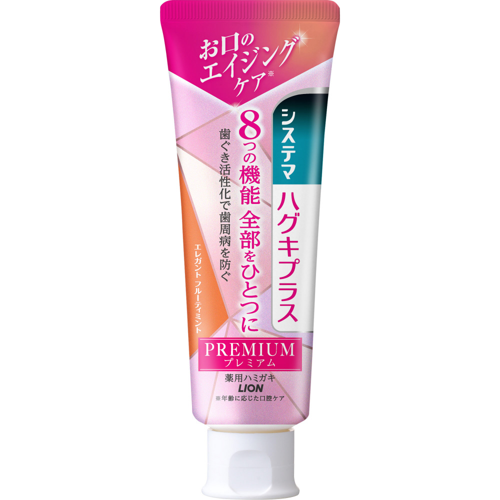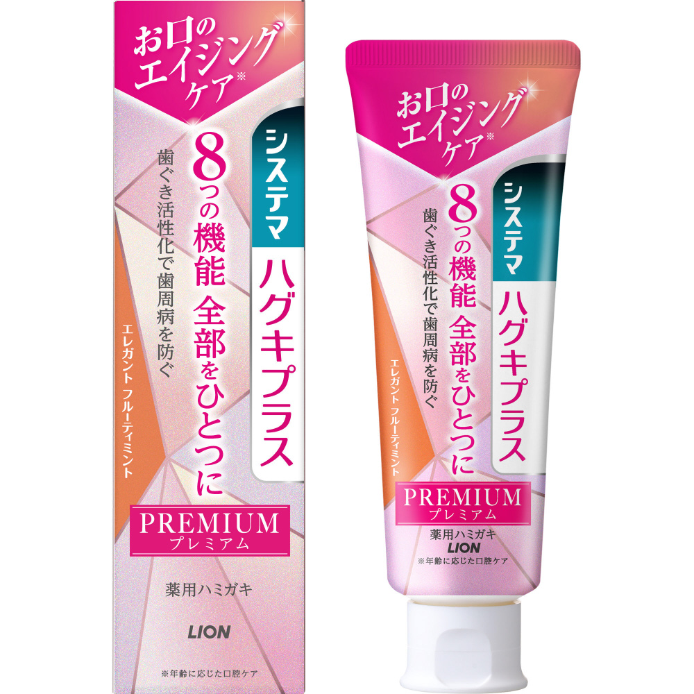 歯ぐき活性化し歯周病を防ぐと共に、8つの機能全部がひとつになった独自のプレミアム処方の薬用ハミガキ。