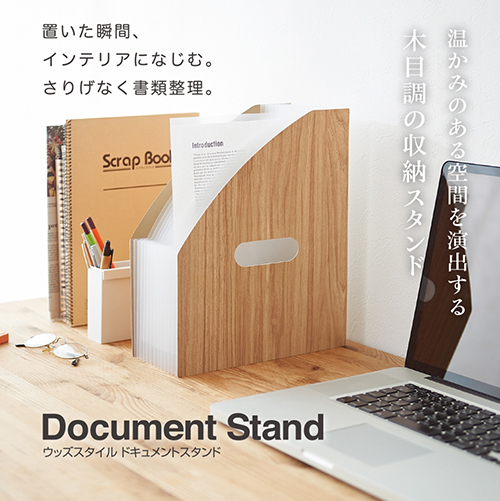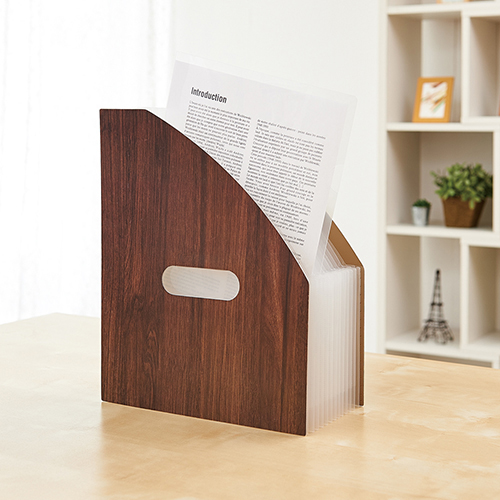 書類の収納量に応じて伸縮!機能的でインテリアにもなじむ木目調の収納スタンド。