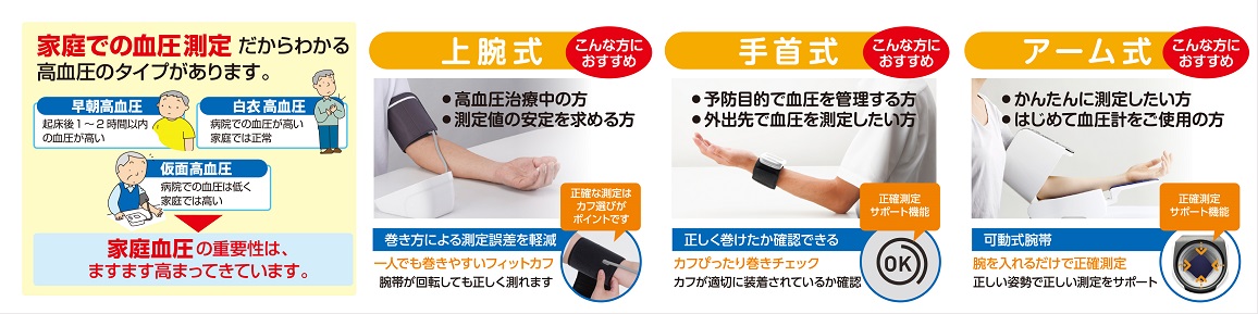 医師がすすめるスタンダードは「上腕式」です。一方、「手首式」には、小型で持ち運びに便利なため、旅行先など外出先で血圧測定が簡単にできるといった利点があります。