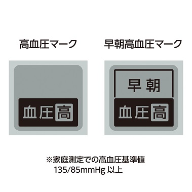 測定結果が、家庭高血圧の基準値*¹とされている「最高血圧135oHg、または最低血圧85oHg以上」の場合、結果表示時に血圧確認マークが点灯します。