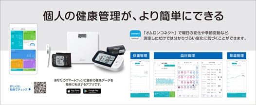 「OMRON connect(オムロンコネクト)」は、オムロンの家庭用健康機器で計測した体重や血圧、歩数などの様々なデータをスマートフォンに転送し、グラフやカレンダーで簡単に記録・管理できるアプリです。転送したデータはグラフでチェックでき、日々の変化を簡単に管理できます。