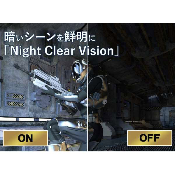 ゲームの暗いシーンに隠れた敵もより鮮明に映し出すことができる「Night Clear Vision(ナイトクリアビジョン)」を搭載。暗闇に隠れた敵や微妙な変化を見逃さず、ゲームを満喫することができます。お好みに合わせて、2段階で調整できます。