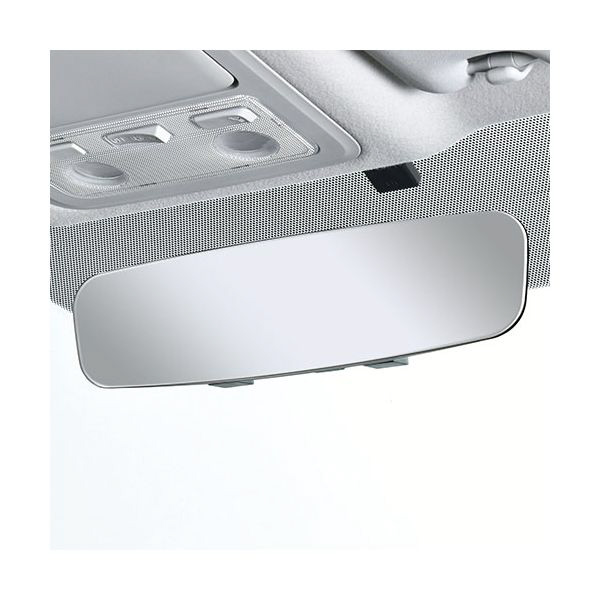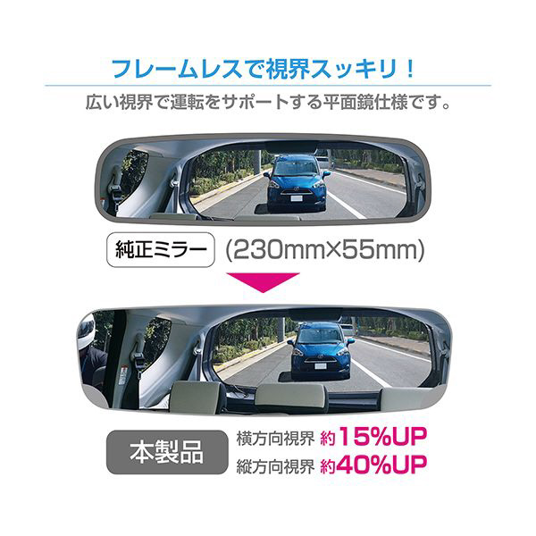鏡カット面を特殊加工によりラウンド形状にすることで実現したスタイリッシュなフレームレスのルームミラーです
