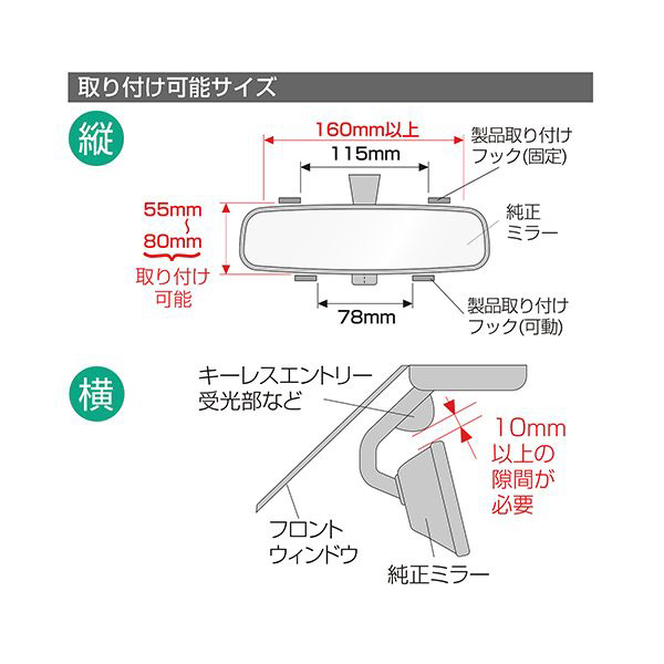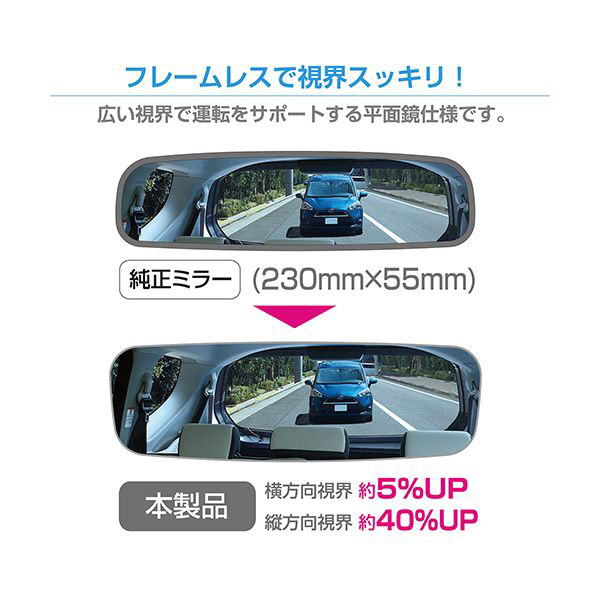 鏡カット面を特殊加工によりラウンド形状にすることで実現したスタイリッシュなフレームレスのルームミラーです