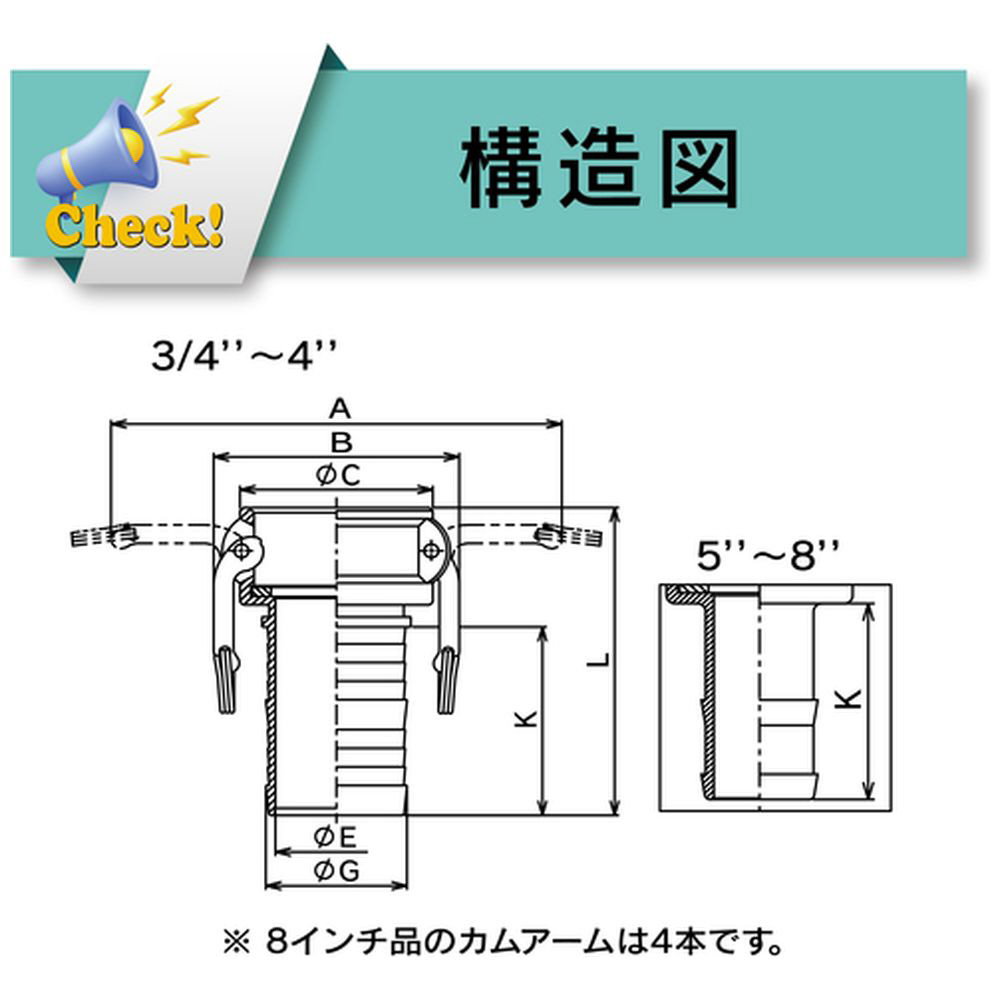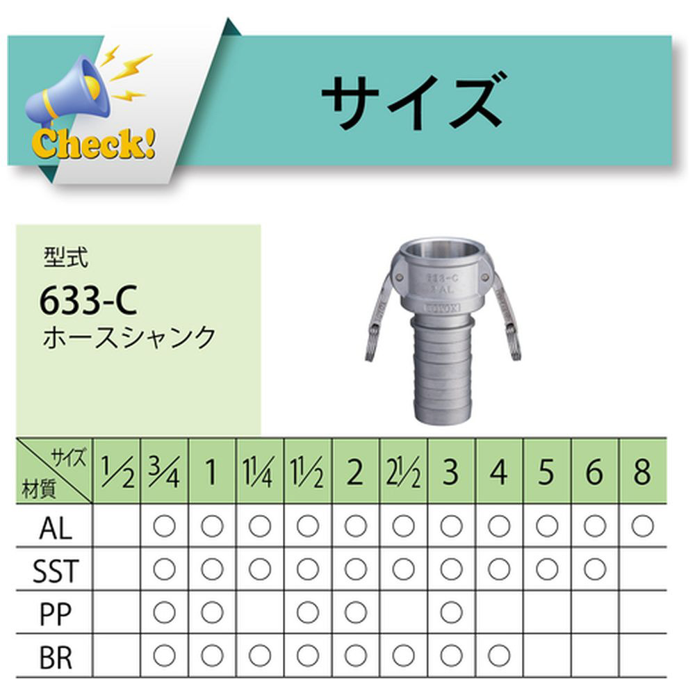■【様々な流体に対応】カムロックの材質は、アルミ合金・ステンレススチール・ポリプロピレン・ブロンズがあり、流体に応じて選定可能です。