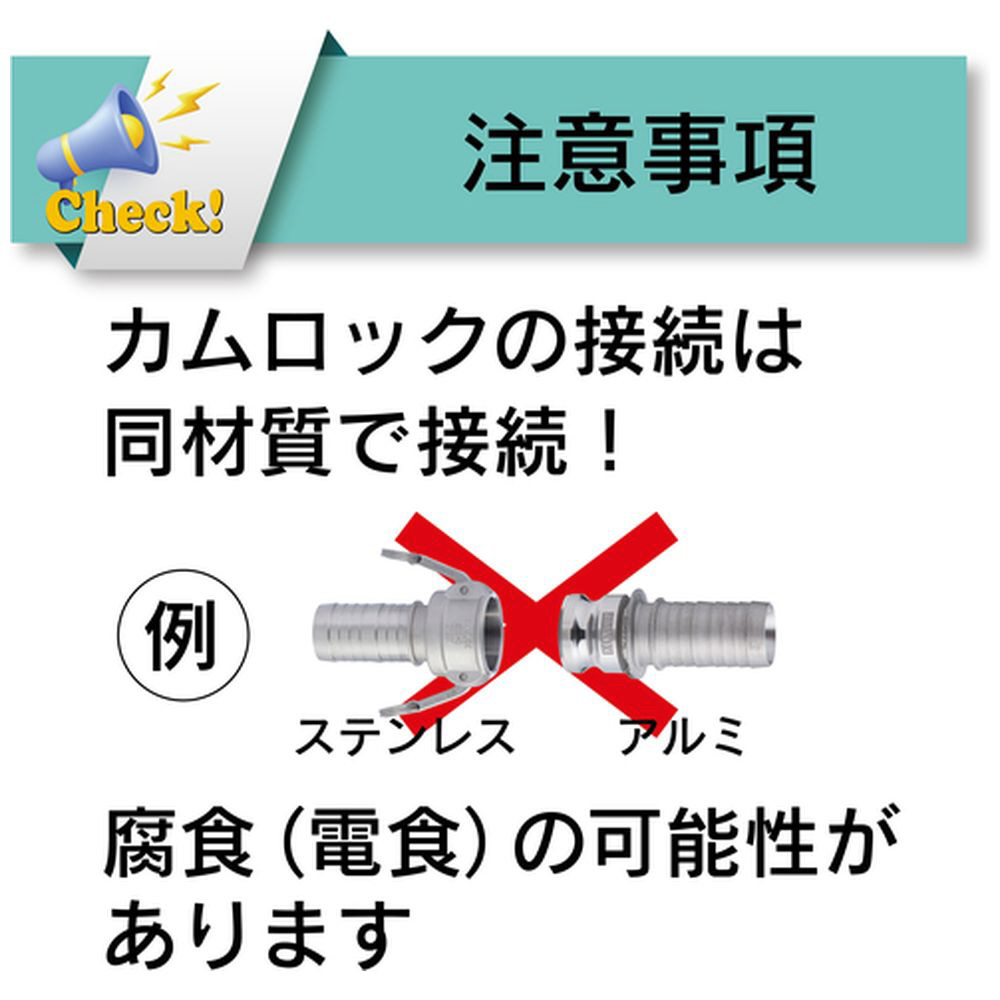 ・製品を接合する際は、同材質のカプラーとアダプターのご使用をお勧めします。材質の異なるカプラーとアダプターを接合する場合、腐食(電食)する場合があります。